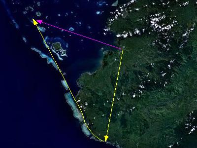 ▲ さて、ヘリポートから飛び立って、すぐに海上に出てマタマノア島まで一直線、かと思ったら、島とは方角の違う内陸に向けて飛び始めました。ツアコンさんは「島まで10分程度です」と言っていたのですが。ジェット機の侵入経路を避けるために、空港周辺では飛べるコースが制限されているんでしょうか。 |