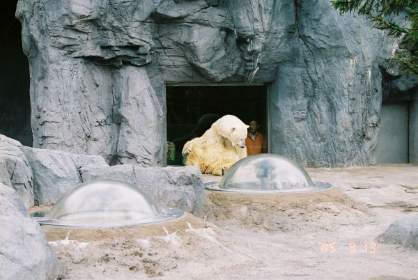 ドームの中から見るとこんな感じ。平日午前中でしたが結構な行列が出来ていて、一人あたりが中に居られる時間は少しなので、運がよくないとシロクマが寄ってくる瞬間は見れません。 |