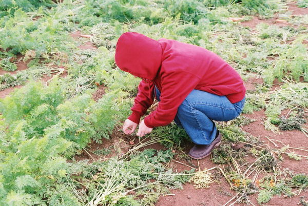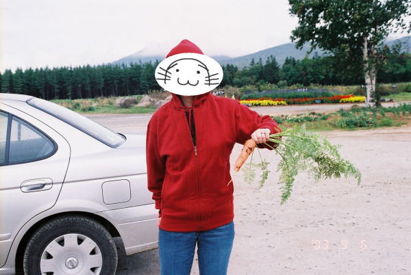 泥棒ではありません。ニンジン畑があって、ご自由に一本お持ちください、と書いてあったので有難く頂戴しているところです。 |