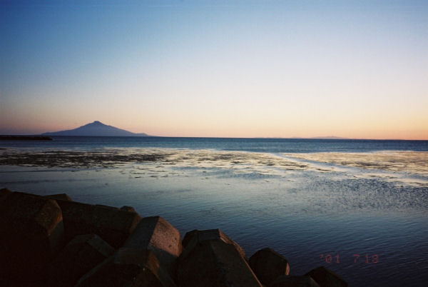 日没間近のノシャップ岬から、利尻島・礼文島を望みます。左が利尻島、右にかろうじて低く見えるのが礼文島です。 |